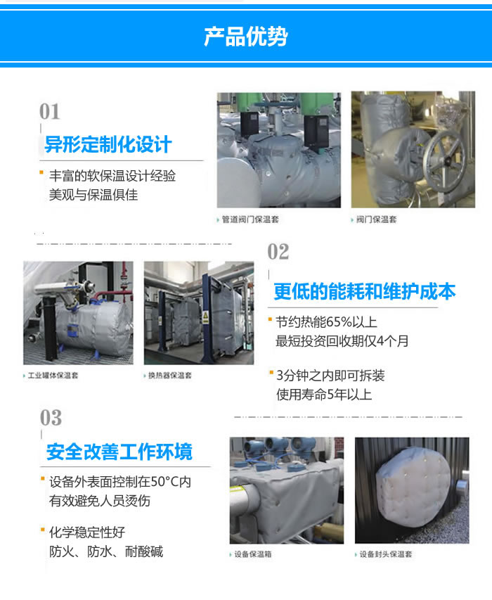 反應釜保溫衣,也可以叫做反應釜保溫套,反應釜保溫罩。反應釜保溫衣使用耐高低溫、防火保溫材料制作而成,拆卸安裝方便簡單,保溫隔熱性能高,可使高達500°C的反應釜表面溫度降低至50℃以下。